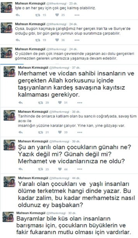 Seçimlerin ardından siyasi mesaj vermeyi bırakan Mahsun Kırmızıgül, bugün attığı tweetlerde Güneydoğu'da yaşananlar için devleti suçladı.Güvenlik güçlerinin gerçekleştirdiği temizlik operasyonlarının ardından PKK'nın köşeye sıkışmasıyla birlikte "sözde barış" çağrısı yapan isimlerin arasına Mahsun Kırmızıgül de eklendi.